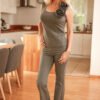 The elegant and comfortable Lisa set is just like that. Bell-bottom pants and a top with sewn-on roses are made of cotton reinforced with elastane. The classic cut combined with a pleasant sweatshirt fabric create a perfect duo. The Lisa set can be successfully worn not only as a whole. A blouse with roses and fitted at the waist and hips pants with wide legs are a must-have for the spring-summer season in every woman’s wardrobe.