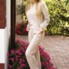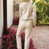 The Maio tracksuit set is characterized by a classic sporty cut, which ensures comfort while wearing. The cotton blend tracksuit fabric enriched with elastane guarantees durability and an aesthetic look even after multiple washes. A delicate golden trim adorning the sleeves of the sweatshirt adds a touch of extravagance. The same trim decorates the pockets of the pants. The Maio set will work not only during physical activity. It will also perform well as an everyday outfit. The length of the pants given in the table refers to the inseam length.