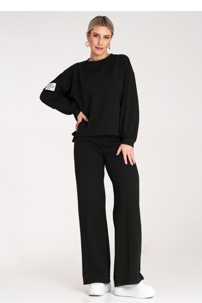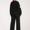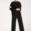 Black tracksuit set. Loose sweatshirt with long, wide sleeves and a round neckline, and wide pants with an elastic waistband and drawstring.