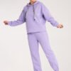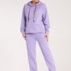 Sweat suit consisting of a comfortable hoodie with a hood and pants with an elastic waistband. The hoodie has a loose fit with contrasting drawstrings at the hood. The pants have an adjustable waist and practical pockets.