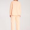 Sweatsuit set. Loose sweatshirt with long sleeves and a round neckline, and pants with an elastic waistband, tied with a drawstring.