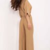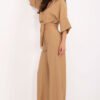 Stylish and comfortable women’s set, perfect for everyday wear. Made of a breathable blend of viscose and nylon, it provides wearing comfort and lightness, ideal for warmer days. The button-up shirt is equipped with a tie at the bottom, allowing for length adjustment and adding a casual character to the whole. There is an elastic band at the waist that emphasizes the waist and ensures a perfect fit. The shirt has a classic collar, 3/4 sleeves, and a chest pocket, combining casual style with functionality. High-waisted pants have wide ankle-length legs, guaranteeing a fashionable look and freedom of movement. The lack of pockets in the pants gives the whole outfit a clean, minimalist look. The dominant smooth pattern and subtle style make the set perfect for everyday stylizations, both for work and for more casual outings.