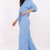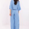 Stylish and comfortable women’s set, perfect for everyday wear. Made of a breathable blend of viscose and nylon, it provides comfort and lightness, perfect for warmer days. The button-up shirt is equipped with a tie at the bottom, allowing for length adjustment and adding a casual character to the whole look. There is an elastic band at the waist that emphasizes the waist and ensures a perfect fit. The shirt has a classic collar, 3/4 sleeves, and a chest pocket, combining a casual style with functionality. The high-waisted pants have wide ankle-length legs, guaranteeing a fashionable look and freedom of movement. The lack of pockets in the pants gives the whole outfit a clean, minimalist look. The dominant smooth pattern and subdued style make the set perfect for everyday styling, both for work and for more casual outings.
