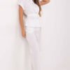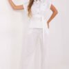 Stylish women’s set consisting of a shirt and trousers is the perfect combination of comfort and elegance for everyday wear. Made of a breathable blend of viscose and linen, it ensures comfortable wear even on warmer days. The smooth material and classic collar give the set a timeless, neat look. The button-up shirt has short sleeves and a practical chest pocket. An additional belt for tying at the waist allows you to adjust the fit to your silhouette and emphasize feminine shapes. The trousers with straight legs, a tie waist, and a high waist are equipped with side, slip pockets, which increases the functionality of the set. An excellent choice for everyday wear and work – light, comfortable, and stylish.