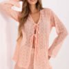 Lace women’s set consisting of a shirt and shorts is the perfect choice for everyday, summer casual styling. Made of a pleasant to the touch blend of cotton, elastane, and polyester, it ensures comfort and freedom of movement. The shirt with long sleeves and a V-neck is fastened in the form of a stylish tie, which adds lightness and a modern character to the whole set. The shorts with wide legs and a high waist are equipped with practical, side slip pockets and a comfortable lining, ensuring comfort and discretion. The lace pattern gives the set a subtle charm, making it an excellent choice for warm days, both for a walk and a meeting with friends.