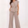 Elegant women’s set consisting of a vest and trousers, perfect for everyday wear, work, and formal occasions. Made of a blend of viscose and polyester, it stands out with a smooth texture and classic character. The vest, buttoned up, has a short, envelope sleeve and a tie at the waist that accentuates the silhouette and adds a feminine charm. High-waisted trousers with an elastic waistband guarantee comfort, while wide legs give lightness and elegance. Side pockets make the set a combination of style and functionality, creating a modern and timeless whole.