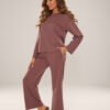 Women’s homewear set in mocca color is a harmonious combination of comfort and subtle elegance. Created with relaxation in mind, it provides maximum comfort and pleasant envelopment throughout the day. Made of exceptionally soft buttery knit fabric, it stands out with a perfectly smooth structure and a delicate, noble sheen that adds a touch of luxury to everyday styling. The loose-fitting blouse has long sleeves and a round neckline. The long pants are equipped with practical pockets, an elastic waistband placed in a tunnel for a perfect fit. An excellent choice for relaxing at home, going for walks, and casual styling. This set is the essence of comfortable homewear – soft, stylish, and extremely comfortable, so you will enjoy wearing it all day long.
