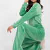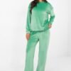 Women’s velour set consisting of a hoodie and pants, made of soft and pleasant to the touch fabric from cotton and polyester. The hoodie has a classic cut with long sleeves and a round neckline, perfect for everyday, casual styling. The pants have straight, long legs with a high waist, equipped with practical side pockets. The whole set is complemented by drawstrings with delicate zircons, adding a subtle, elegant shine to the complete outfit. The smooth pattern and comfortable fit make the set perfect for everyday wear and home relaxation.