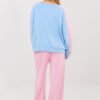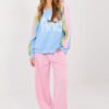 Stylish women’s tracksuit set consisting of a sweatshirt and pants, maintained in a casual style, perfect for everyday wear. It will work perfectly during daily activities, walks or relaxation at home. Made of high-quality polyester, viscose, and elastane blend, which provides comfort, flexibility, and a good fit to the silhouette. The sweatshirt with long sleeves and a classic, round neckline has been decorated with a logo on the front, giving the whole a modern character. The pants with long, wide legs and a high waist guarantee comfort of wearing, and the side pockets increase functionality. Stripes on the sleeves of the sweatshirt are a stylish accent emphasizing the sporty-urban look.