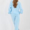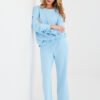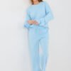 Stylish women’s set consisting of a sweatshirt and pants, perfect for everyday casual styling. Made of soft and pleasant to the touch viscose with elastane, which ensures comfort and freedom of movement throughout the day. The long-length sweatshirt has a round neckline and long sleeves, decorated with a subtle fabric rose at the wrist, adding a feminine and original character to the whole. High-waisted pants with straight legs guarantee comfort and a timeless look. The waist features an inserted elastic band and drawstrings for a perfect fit to the silhouette. Additional advantages are the side slip pockets, increasing the functionality of the set. The smooth pattern makes the set versatile and easy to style, perfect for both a walk and everyday wear. This is a proposal for women who value comfort, style, and subtle details.