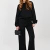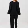 Stylish women’s set consisting of a sweatshirt and pants, perfect for everyday casual styling. Made of soft and pleasant to the touch viscose with elastane, which ensures comfort and freedom of movement throughout the day. The long-length sweatshirt has a round neckline and long sleeves, adorned with a subtle fabric rose at the wrist, adding a feminine and original character to the whole. High-waisted pants with straight legs guarantee comfort and a timeless look. The waist features an inserted elastic band and drawstrings for a perfect fit to the silhouette. Additional advantages are the side slip pockets, increasing the functionality of the set. The smooth pattern makes the set versatile and easy to style, perfect for both a walk and everyday wear. This is a proposition for women who value comfort, style, and subtle details.