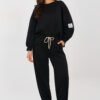 Stylish sweat suit in a casual edition is the perfect proposal for everyday stylizations. The smooth pattern gives it a universal character, making it perfect for relaxation, walks, and urban outfits. The long-sleeved blouse with a round neckline provides comfort and a timeless look. An additional advantage is the subtle patch placed on the left sleeve, which gives the whole a fashionable accent. Pants with long legs finished with cuffs perfectly fit the silhouette. The high waist emphasizes the waist and increases comfort of wearing, while the side slip pockets add functionality. The set is made of a soft and elastic blend of viscose and elastane, which guarantees wearing comfort, freedom of movement, and perfect fit to the silhouette. It is a comfortable and stylish set for everyday wear. The buttery material is soft, delicate, and exceptionally pleasant to the touch.