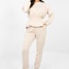 Stylish women’s set consisting of a sweatshirt and trousers, perfect for everyday wear and for work in a less formal setting. The casual character of the set combines comfort with modern, minimalist design. The model is made of high-quality blend of polyester, viscose and elastane, making the material soft, flexible and pleasant to wear. Smooth fabric emphasizes the universal style of the set and facilitates creating various stylizations. The sweatshirt with long sleeves and a classic, round neckline provides comfort and a timeless look. Ruching at the waist adds lightness and subtly emphasizes the silhouette. Trousers with a high waist and an elastic waistband guarantee a comfortable fit. Long legs finished with ribbed cuffs give a sporty touch, and side slip pockets increase functionality. This practical and stylish set will work well both during everyday duties and at work, providing comfort throughout the day. Butter-like material is soft, delicate and exceptionally pleasant to the touch.