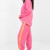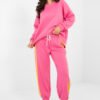 Stylish tracksuit set consisting of a sweatshirt and pants is an ideal everyday proposition for people who appreciate comfort in a fashionable edition. Made of high-quality blend of polyester, viscose, and elastane, the material is soft, elastic, and pleasant to the touch, providing comfort throughout the day. The sweatshirt with a classic, round neckline and long sleeves fits perfectly into a casual style. The smooth pattern gives the whole a universal character, making it easy to match the set with various accessories. The high-waisted pants have a practical tie at the waist, allowing for individual adjustment. The model with long legs finished with cuffs provides comfort and a sporty look. Side, slip pockets increase functionality, and fashionable stripes on the sides of the legs add a dynamic and modern accent to the whole. It is an excellent choice for everyday outings, walks, or relaxation in the comfort of your own home, combining comfort and style in one set.
