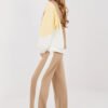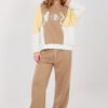 Exceptionally comfortable women’s tracksuit made of extremely soft, delicate and pleasant to the touch buttery material. The fabric, a blend of polyester, viscose, and elastane, is elastic, slightly flowing, and perfectly drapes on the silhouette, ensuring maximum comfort in everyday use. The set consists of a long-sleeved sweatshirt and wide, long pants. The sweatshirt with a classic, round neckline has been adorned with an eye-catching inscription with sequin accents, giving the whole a fashionable and feminine character. High-waisted pants beautifully accentuate the waist and provide comfort when wearing. There are drawstrings in the waist for a perfect fit to the silhouette. Practical side pockets increase functionality, and wide legs give the outfit a casual, modern look. This is the perfect set for women who appreciate a combination of exceptional softness, comfort, and fashionable details in their daily stylings.