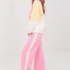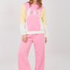 Exceptionally comfortable women’s tracksuit made of extremely soft, delicate and pleasant to the touch butter-like material. The fabric, a combination of polyester, viscose and elastane, is elastic, slightly flowing and perfectly shapes the silhouette, providing maximum comfort in everyday use. The set consists of a long-sleeved blouse and pants with wide, long legs. The blouse with a classic, round neckline has been decorated with an eye-catching inscription with sequin accents, giving the whole a fashionable and feminine character. The high-waisted pants beautifully accentuate the waist and ensure comfort when worn. There are drawstrings in the waist for perfect fitting to the silhouette. Practical side slip pockets increase functionality, and the wide legs give the styling a casual, modern look. This is the perfect set for women who appreciate the combination of exceptional softness, comfort, and fashionable details in their everyday stylings.
