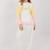Exceptionally comfortable women’s tracksuit made of buttery soft material that is extremely soft, delicate and pleasant to the touch. The fabric, a combination of polyester, viscose, and elastane, is elastic, lightly flowing, and perfectly drapes on the silhouette, providing maximum comfort in everyday use. The set consists of a long-sleeved sweatshirt and pants with wide, long legs. The sweatshirt with a classic, round neckline has been decorated with an eye-catching inscription with sequin accents, giving the whole a fashionable and feminine character. The high-waisted pants beautifully emphasize the waist and provide comfort when worn. There are drawstrings at the waist for perfect fit to the silhouette. Practical side pockets increase functionality, and wide legs give the outfit a casual, modern look. This is the perfect set for women who appreciate the combination of exceptional softness, comfort, and fashionable details in their everyday styling.