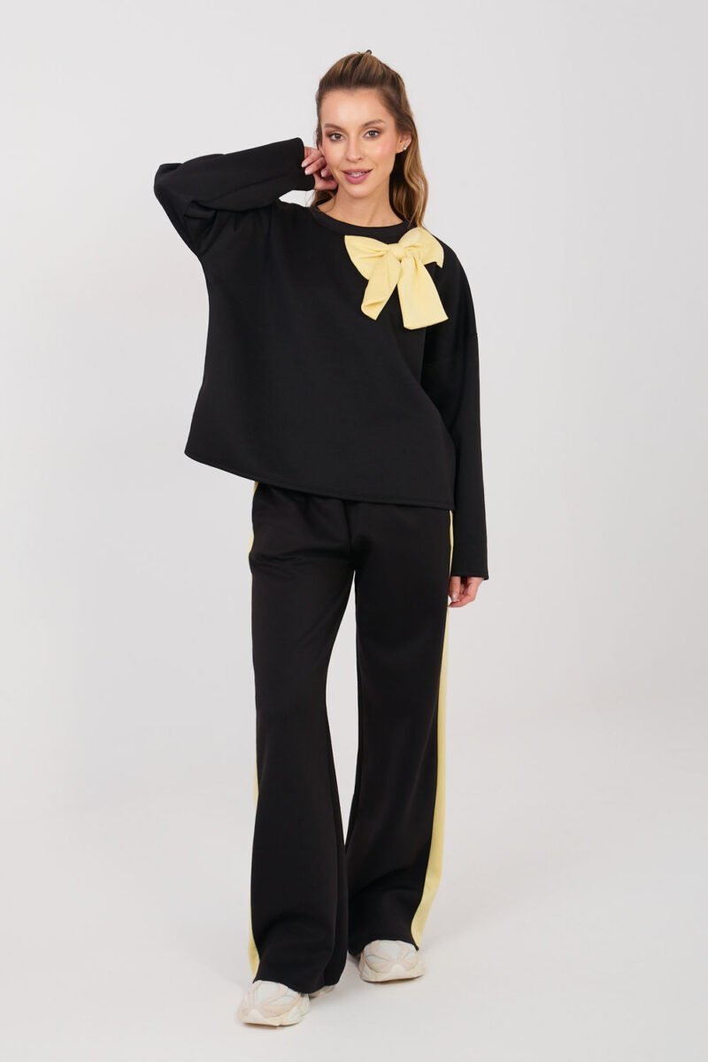 Stylish women’s tracksuit set in a casual version is the perfect choice for everyday wear. The combination of comfort with trendy details makes the set perfect for daily activities, walks, or casual meetings. The set consists of a long-sleeved sweatshirt with a classic round neckline and long pants with wide legs. The smooth pattern emphasizes the universal character of the set, making it easy to match with different accessories. The sweatshirt is decorated with an eye-catching contrasting bow on the front, adding a feminine and subtly elegant touch to the whole look. The high-waisted pants beautifully shape the waist, and the elastic waistband ensures a comfortable fit to the silhouette. Additional advantages are practical side pockets and stripes running along the legs, giving a sporty character and visually slimming the legs. The set is made of a pleasant to touch blend of polyester, viscose, and elastane material is soft, elastic, and resistant to creases, guaranteeing comfort throughout the day. This is a comfortable and feminine set that combines sporty freedom with trendy details.