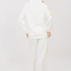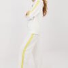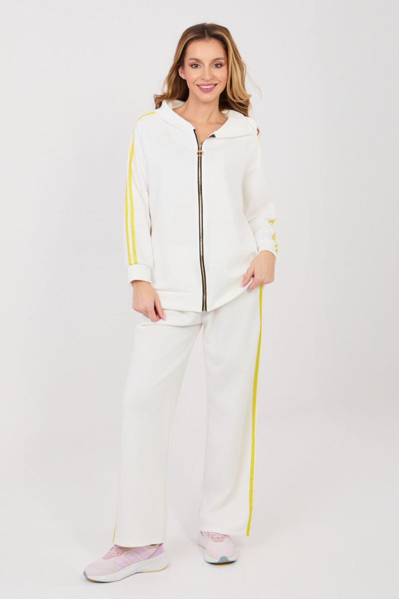 Women’s tracksuit set consisting of a hoodie and pants, perfect for everyday casual styling. The smooth pattern makes the set look modern and versatile, making it great for a walk, shopping, or relaxation. The set is made of a comfortable and pleasant blend of polyester, elastane, and viscose. The material is soft, elastic, and fits well, providing comfort throughout the day. The long-sleeved hoodie has a practical hood and a zipper closure, making it easy to put on and allowing you to adjust it to the weather. An additional advantage is the side pockets. The sleeves are decorated with trendy stripes, giving the set a sporty character. The pants have a high waist and long, wide legs that ensure freedom of movement. There is an elastic band and a tie at the waist for a better fit. The stripes on the legs emphasize the modern, sporty-casual style of the set.