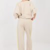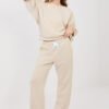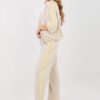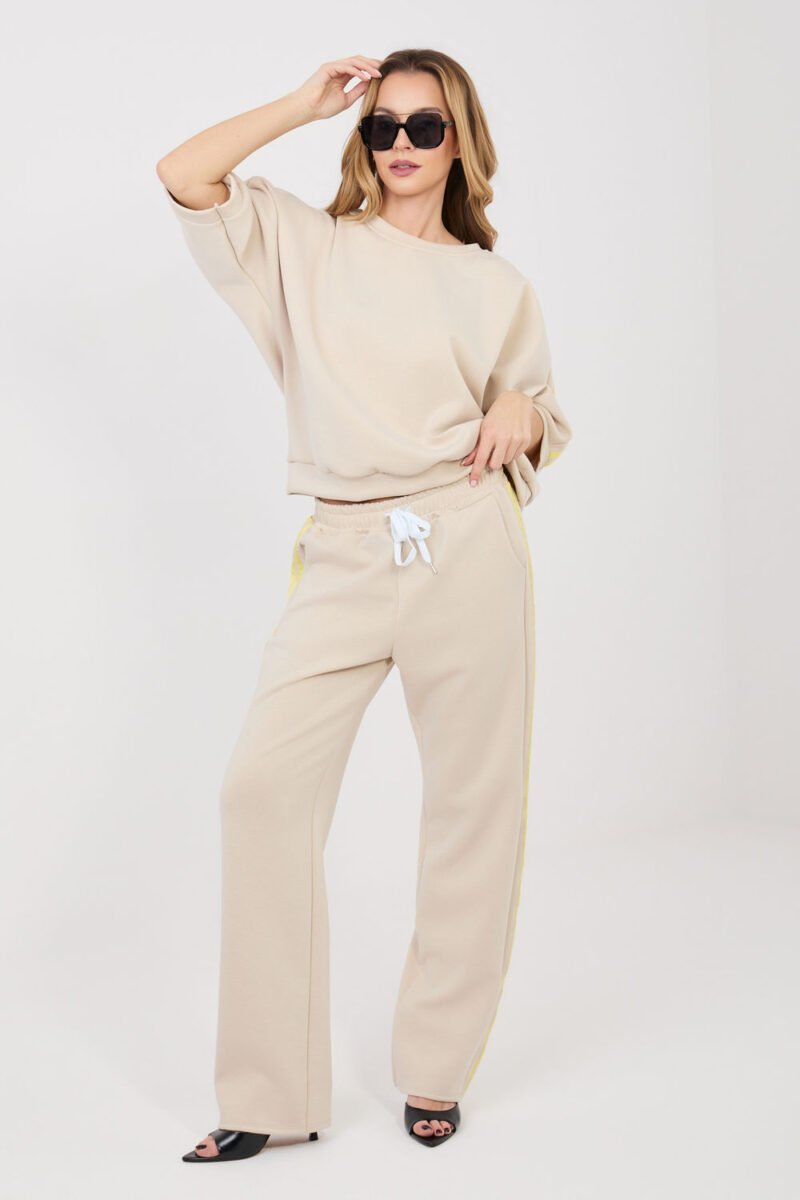 Women’s tracksuit set consisting of a blouse and pants, perfect for everyday casual styling. The smooth pattern makes the set versatile and easy to match for various occasions, from walks, through shopping, to home relaxation. The set is made of a pleasant to wear blend of polyester, viscose, and elastane. The “butter” type material is exceptionally soft, delicate, and extremely pleasant to the touch, providing high wearing comfort and freedom of movement. The pants have a high waist and long, straight legs that fit well on the silhouette. There is a practical tie at the waist for adjustment to the figure. The model is also equipped with comfortable, side slip pockets. The blouse with elbow-length sleeves complements the whole set perfectly. The additional decorative element is trendy stripes running along the sleeves and legs, giving the set a sporty and modern character.