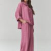 Stylish women’s set in fashionable shades is the perfect proposal for spring and summer. The set consists of a loose shirt buttoned up and wide trousers with an elastic waist, which guarantees maximum comfort and freedom of movement. Made of lightweight, breathable material. The fabric is soft, breathable, and pleasant for the skin, providing comfort throughout the day. This women’s set with a shirt and trousers is an excellent base for many stylizations. Combine it with sneakers, sandals, or flip-flops to create a casual look, or add elegant accessories for a more chic effect. Made in Italy.