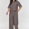 This elegant set is the perfect choice for spring and summer days when you want to combine a fashionable look with high quality. The set includes a loose blouse with a boxy cut, which is perfect for elegant stylings. The short sleeves and simple cut of the blouse make it an excellent option for both formal and informal occasions, combining elegance with comfort. The pants stand out with wide legs, giving the styling a modern and elegant look. The elastic waistband ensures comfort, and their length adds class and style to the whole outfit. The model is made of delicate and lightweight material imitating linen. The simple yet sophisticated cut gives the set a timeless character that will look stylish on any silhouette. The set is perfect for business meetings, elegant outings, or trips to the city when you want to combine elegance with comfort. You can pair it with heels, elegant sandals, or white sneakers.