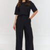 This elegant set is the perfect choice for spring and summer days when you want to combine a fashionable look with high quality. The set includes a loose blouse with a boxy cut, which perfectly complements elegant stylizations. The short sleeve and simple cut of the blouse make it an excellent option for both formal and informal outings, combining elegance with comfort. The pants stand out with wide legs, giving the outfit a modern and elegant look. The elastic waistband ensures comfortable wear, while their length adds class and style to the whole look. Made from delicate and lightweight linen-imitating material, this model has a simple yet refined cut that gives the set a timeless character, looking stylish on any silhouette. The set is perfect for business meetings, elegant outings, or city trips when you want to combine elegance with comfort. You can pair it with heels, elegant sandals, or white sneakers.