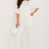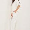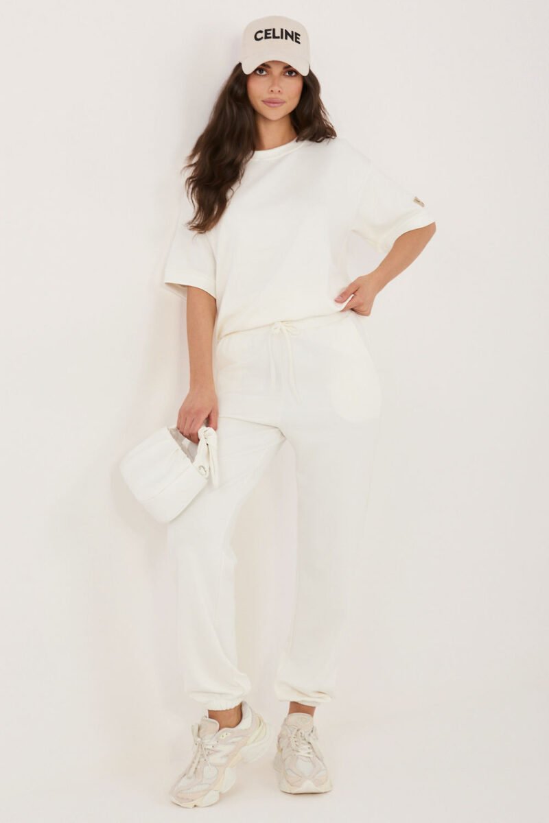 Women’s tracksuit set consisting of a sweatshirt and pants is the perfect everyday option for women who appreciate comfort and modern style. The smooth cut gives it a universal character, making it perfect for both home styling and city outings. The short-sleeved sweatshirt with a classic, round neckline provides comfort and freedom of movement. An additional accent is the patch on the sleeve, which gives the whole a fashionable look. The pants with a long leg finished with cuffs perfectly fit the silhouette. The model is equipped with practical, side slip pockets, which increase functionality. The set is made of a pleasant to the touch blend of viscose and elastane, which guarantees comfort, flexibility, and perfect fit. The model has no closure, which further emphasizes its casual, comfortable character.