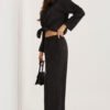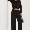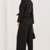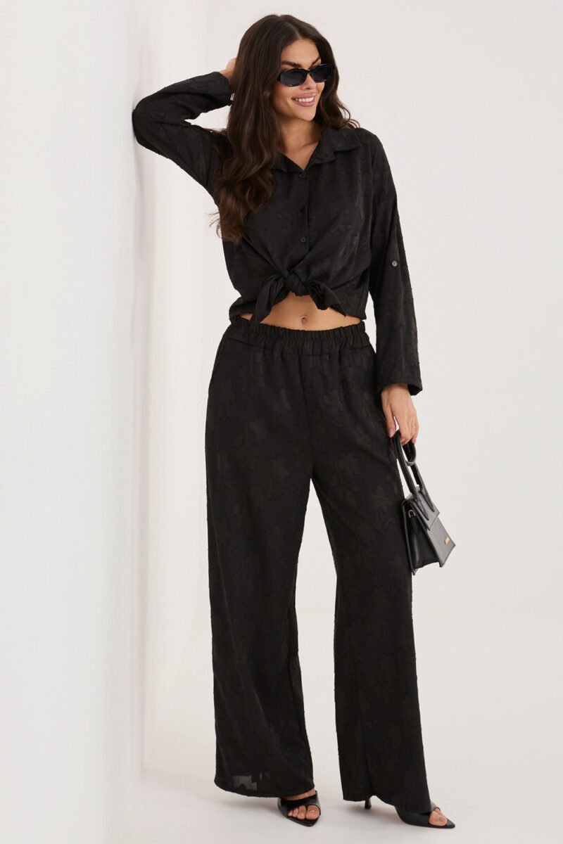 Ladies set consisting of a shirt and trousers is a stylish and comfortable option for everyday wear. It stands out with a varied texture of the material, which gives the whole a modern and original character. The shirt with long sleeves, a classic collar and button fastening looks elegant, yet casual, making it perfect for both casual and more formal stylizations. The trousers with long legs have an elastic waistband with an inserted rubber band, which ensures a comfortable fit to the silhouette and comfort of wearing throughout the day. Additionally, they have practical, side slip pockets. The set made of a soft and pleasant to the touch mixture of viscose and elastane guarantees lightness, flexibility and freedom of movement. It is an ideal choice for women who value comfort combined with a fashionable look.