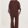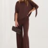 Women’s set consisting of a blouse and trousers is a comfortable and stylish proposition for everyday wear and work. Made of soft and pleasant to the touch fabric with a touch of viscose and elastane, it provides comfort, freedom of movement, and a good fit to the silhouette. The blouse has a classic, round neckline and 3/4 sleeves with a tie at the end, giving the whole a subtly feminine character. The smooth material makes the set look minimalist and elegant, making it easy to match with different stylizations. The trousers have long, wide legs and practical side pockets that increase the functionality of the model. An elastic band is sewn in at the waist, ensuring a comfortable fit without pressure. This is a universal set perfect for both everyday stylizations and work, combining comfort with a modern, neat look.