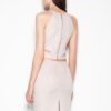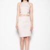 Elegant suede set: fitted skirt before the knee and a strappy blouse with original triangular cut-outs on the sides. Model with an original cut.