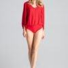 Red, loose-fitting, slightly transparent bodysuit in a fabric decorated with glitter, with long sleeves finished with an elastic band. Serek neckline. Body covering up body imperfections.