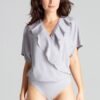 Grey body with falling, kimono short sleeves. Envelope neckline with decorative ruffle.