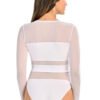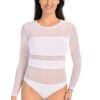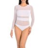 The bodysuit is made of soft and comfortable viscose material combined with transparent mesh on the chest and waist. The underwear is also made of viscose, thick and opaque. The crotch is made easy to close with two or three hooks, depending on the size. The sleeves are made of mesh for a comfortable fit and are finished with a semicircular hem around the neck. This finish allows the corset and silhouette to be seen. The bodysuit has a pronounced cut at the waist that effectively shapes the silhouette, making it attractive and sexy. The mesh bodysuit can be worn with a jacket for a daily commute or for an evening out or dinner with friends. It is an essential part of every woman’s closet. Another advantage is that the bodysuit goes well with other outfits, especially with pencil pants, jeans and skirts.