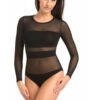 Made of transparent mesh combined at the bust and waist with soft and pleasant to the touch viscose. The panty part is also made of viscose, which is thicker and not see-through. At the crotch, the bodysuit fastens with two- or three-step hooks, depending on the size, which make it easy to put on and take off. The sleeves are long and tightly fitted with mesh, and around the neck the bodysuit is finished with a semi-circular hem. Such a finish nicely exposes the breasts and silhouette. The cut of the bodysuit is strongly waisted, and thanks to this the bodysuit effectively shapes the figure, gives it an alluring and sexy look. Mesh bodysuit can be worn every day at work and with a jacket, or for an evening walk or dinner in pleasant company. It is a closet item that should be in every woman’s closet. An additional plus is that the bodysuit blends perfectly with the rest of the outfit especially with fitted pencil pants or jeans or skirt. Wearing this type of mesh bodysuit with a skirt or pants guarantees that nothing will roll down, as, for example, would happen with a blouse. The quality of the bodysuit is very high, so that when washed according to the label it will retain a long life, will not stretch, will not get wrinkled and will not change color.