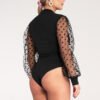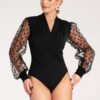 Dress with a deep envelope neckline and eye-catching polka dot tulle sleeves.