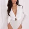 Elegant body of standard length, made of a dominant material of soft and pleasant to the touch polyester with the addition of elastane, which ensures a perfect fit to the silhouette. The model is distinguished by a deep neckline in a V-shape, emphasizing the feminine line of the neck and bust. Decorative gathering with a metal application is placed under the bust, adding an elegant character to the whole. Long sleeves and a smooth, elegant pattern make the body blend perfectly with both classic stylizations and evening sets. Fastened with a hook, it guarantees comfort and stable positioning on the body. An ideal choice for women who appreciate style, comfort, and subtly sensual details.