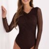 Elegant bodysuit made of delicate mesh, which attracts attention with a spectacular application of shimmering dots. The model of standard length perfectly fits the silhouette, emphasizing its advantages. The round neckline and long sleeves give the whole a classic yet refined character. Subtle ruching adds elegance and lightness to the bodysuit. The interior of the model is equipped with lining, except for the sleeves, which ensures comfortable wearing and aesthetic finish. The material made of a combination of polyester and viscose is pleasant to the touch and drapes well on the body. The practical fastening with hooks at the crotch increases usability. The bodysuit will be perfect for evening and elegant stylizations.