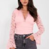 Elegant bodysuit made of a combination of polyester and elastane, combining comfort with refined style. A model of standard length with a V-neckline emphasizes the silhouette and gives the whole a subtly feminine character. The long, flared lace sleeve adds lightness and elegance, and the decorative ruching on the material on the front is a stylish detail that distinguishes the bodysuit. The sewn-in, stiffened cups and practical hook fastening ensure high functionality, making it easy to put on and take off. The dominant smooth pattern makes the bodysuit versatile and perfect for both special occasions and elegant everyday stylizations.