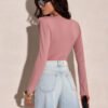 A long-sleeved bodysuit with a wrap neckline is the quintessence of feminine style and elegance. Made of soft, elastic material, it perfectly fits the silhouette, emphasizing its assets. The wrap cut subtly exposes the neckline, adding chic and lightness to the whole. Included in the set is a belt with a fabric rose, which is a unique, romantic accent that complements the outfit beautifully. Perfect for elegant outings, dinners, or special occasions. The bodysuit is designed and made in Poland.