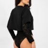 Two-layer body in a casual style is a combination of comfort and feminine aesthetics. The model stands out with a varied texture of the material, which gives the whole a modern character. Made of a combination of polyester, viscose, and elastane, the body is elastic, soft, and comfortable to wear. The body has a standard length and a classic, round neckline. Long, lace sleeves and a lace bottom layer add lightness and subtle elegance, while the outer layer in the form of a short-sleeved shirt creates a stylish, layered look. The model fastened with hooks ensures comfort and a good fit. It is an ideal proposal for everyday stylizations with both jeans and a skirt.