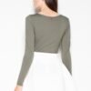 Fitted long-sleeved bodysuit with an effective flowing neckline. A model perfectly matching tight, classic jeans.