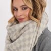 Scarf made of high-quality blend of viscose and wool delights with a pleasant to the touch texture and elegant finish. Its geometric, dominant pattern gives the whole a modern character. The model has impressive dimensions of 148 × 148 cm, so it can be worn in many ways, both as a classic scarf and a stylish shawl. Additional charm is added by delicate fringes, which emphasize the lightness and freedom of styling.