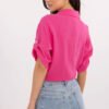 Stylish women’s shirt in a casual style, perfect for everyday wear. Made of breathable, natural cotton, it provides comfort throughout the day. The short length and tie at the bottom give it lightness and a girly character, while the 3/4 sleeve is perfect for warmer days. The shirt is buttoned up and equipped with a classic collar, giving it a universal, relaxed look. At chest height, there is a practical pocket decorated with a subtle print, which adds a delicate yet fashionable accent.