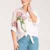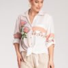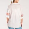 Women’s shirt with an asymmetrical design, combining stripes with embroidered floral and ethnic motifs. The model features a classic collar, a chest pocket, and a tie at the bottom. Loose fit style suitable for many body types.