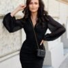 The unique mini dress is sure to grab attention at any occasion. The top of the dress is an overlapping V-shaped neckline, which also gently accentuates the back. The long, buffeted sleeves, which give the whole look classy and chic, are finished with an elastic band. The cut-off under the bust emphasizes and slims the waist, and the placed draping enhances the shape of the silhouette. The lower part of the dress is a fitted skirt characterized by a fashionable crease. Its length reaching above the knees and creases add delicacy and subtlety. The entire dress is fastened with a covered zipper at the back of the dress, making it easy to put on. Sarah dress has a lining. This model of dress is an excellent option as a complete styling, which will be perfect for various celebrations. The product is manufactured and sewn in Poland.