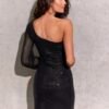 Asymmetrical mini dress with long sleeves, made of high-quality fabric covered with sequins. Cut to fit, the slit presents the leg. Original one-shoulder cutout and long buffet sleeve, will make you feel feminine and sensual in it. Fastened at the back with a covered zipper. Interesting form and sequins make this model really unique. Its length will beautifully expose your legs, and the fitted cut will emphasize your feminine assets. The creation will suit many occasions, it will be perfect for Andrzejki, New Year’s Eve, or a birthday party. The product is made and sewn in Poland.