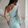 Mini dress with a beautiful sequined one-shoulder sleeve. Asymmetric top, also with sequin insert. The bottom of the dress is short, smooth, and pleated. The dress has a lining, fastened with a concealed zipper. Perfect dress for elegant parties.