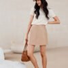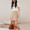 The Jackie skirt is made of leather-like material, which is perfect for the autumn-winter season. The skirt is in a trapeze shape, which looks good on every silhouette. The reinforced waistband beautifully accentuates it, and the mini length showcases the legs. There is an elastic band sewn in the back, ensuring a perfect fit and comfort. An additional asset of the skirt are pockets placed on the sides. The skirt has a lining sewn in. The Jackie skirt will look great in autumn-winter stylings with an oversized sweater and chunky lace-up boots, as well as in a more elegant version, paired with a blouse and heeled ankle boots. A large bag and a warm scarf will be a stylish addition to the whole look. A leather skirt is a perfect option for various occasions, from everyday meetings to elegant outings. The product is manufactured and sewn in Poland.