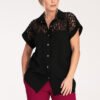 Short-sleeved shirt with an extended cut, buttoned. Shirt with a classic collar. The top part is see-through, decorated with characteristic mottles.